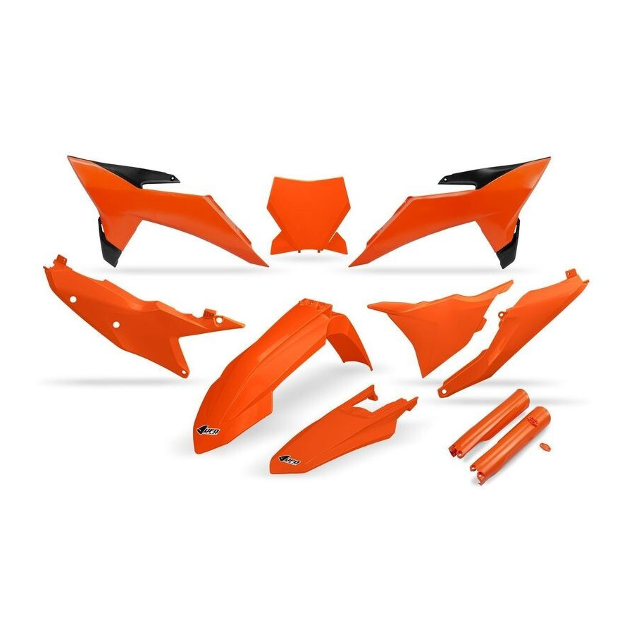 Redonnez une nouvelle jeunesse à votre Ktm avec ce kit plastiques Ufo coloris origine qui se fixe sur les points d'origine et faites vous plaisir sur les terrains de motocross ou vos sorties enduro !